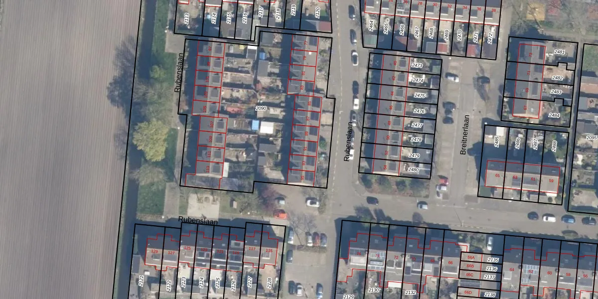 Het perceel waarop Rubenslaan 91 staat heeft een oppervlakte van 2466 m². Dit is een zeer groot perceel. De perceeloppervlakte wordt geregistreerd door het Kadaster. Gedetailleerde informatie over de maten van dit perceel kunt u vinden in het rapport Kadastrale kaart met maatvoering van Rubenslaan 91.