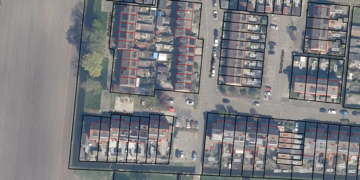 Het perceel waarop Rubenslaan 95 staat heeft een oppervlakte van 2466 m². Dit is een zeer groot perceel. De perceeloppervlakte wordt geregistreerd door het Kadaster. Gedetailleerde informatie over de maten van dit perceel kunt u vinden in het rapport Kadastrale kaart met maatvoering van Rubenslaan 95.