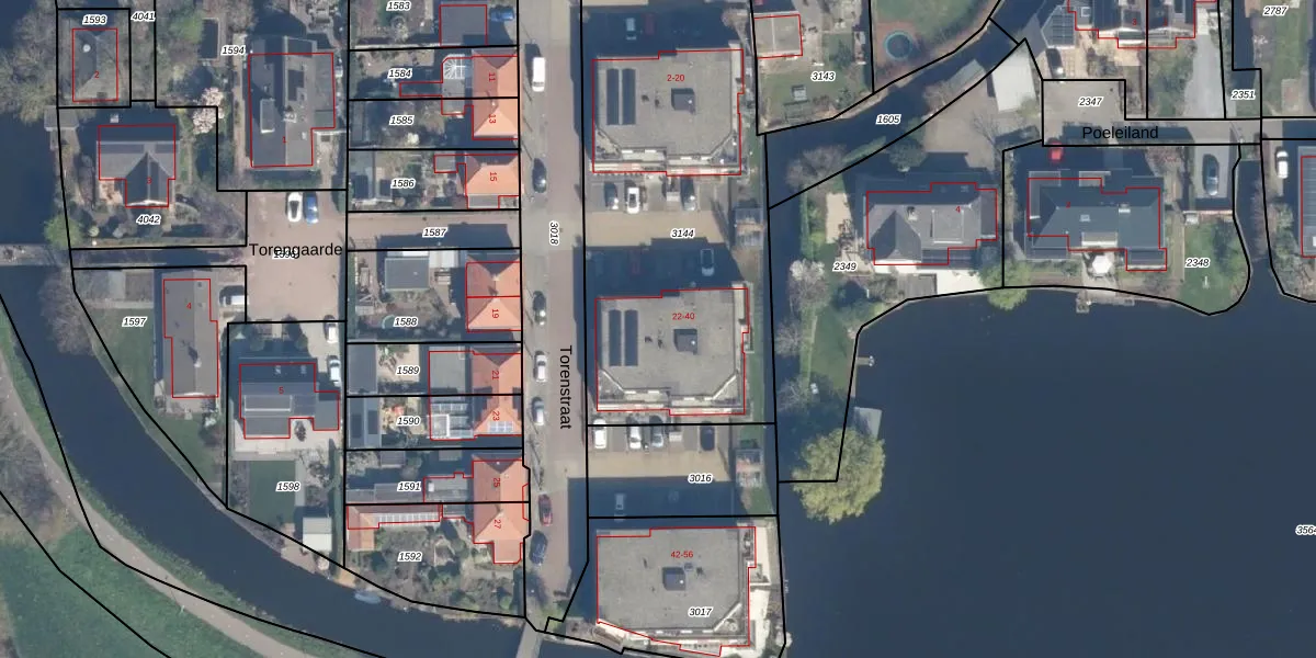 Het perceel waarop Torenstraat 24 staat heeft een oppervlakte van 2485 m². Dit is een zeer groot perceel. De perceeloppervlakte wordt geregistreerd door het Kadaster. Gedetailleerde informatie over de maten van dit perceel kunt u vinden in het rapport Kadastrale kaart met maatvoering van Torenstraat 24.