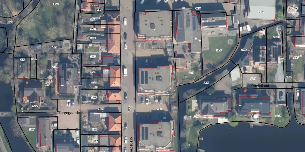 Het perceel waarop Torenstraat 4 staat heeft een oppervlakte van 2485 m². Dit is een zeer groot perceel. De perceeloppervlakte wordt geregistreerd door het Kadaster. Gedetailleerde informatie over de maten van dit perceel kunt u vinden in het rapport Kadastrale kaart met maatvoering van Torenstraat 4.