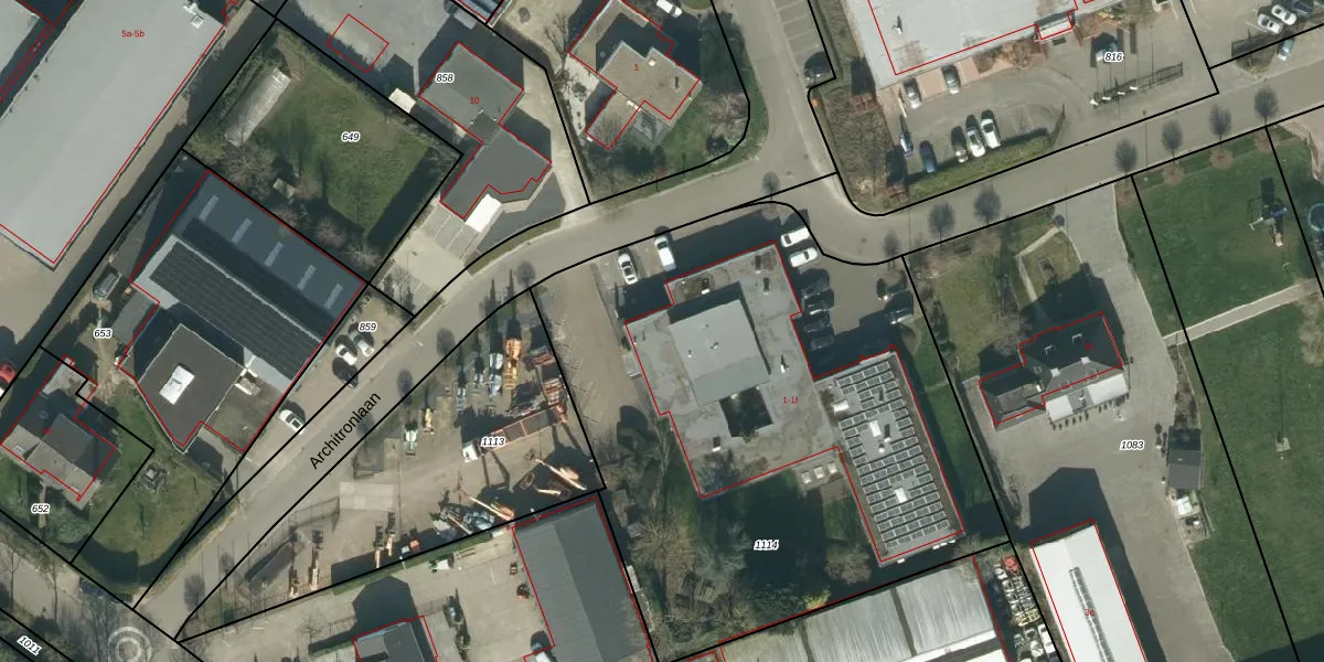 Het perceel waarop Architronlaan 1-f staat heeft een oppervlakte van 3187 m². Dit is een zeer groot perceel. De perceeloppervlakte wordt geregistreerd door het Kadaster. Gedetailleerde informatie over de maten van dit perceel kunt u vinden in het rapport Kadastrale kaart met maatvoering van Architronlaan 1-f.
