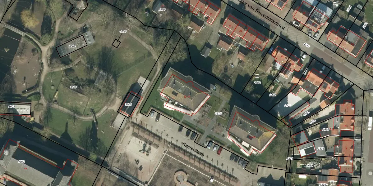 Kasteellaan 45 is gelegen op kadastraal perceel HDL01H3274. Deze kadastrale aanduiding is uniek en wordt gebruikt door het Kadaster om eigendomsrechten en andere zakelijke rechten vast te leggen. Het perceel maakt onderdeel uit van de kadastrale gemeente Hedel.
