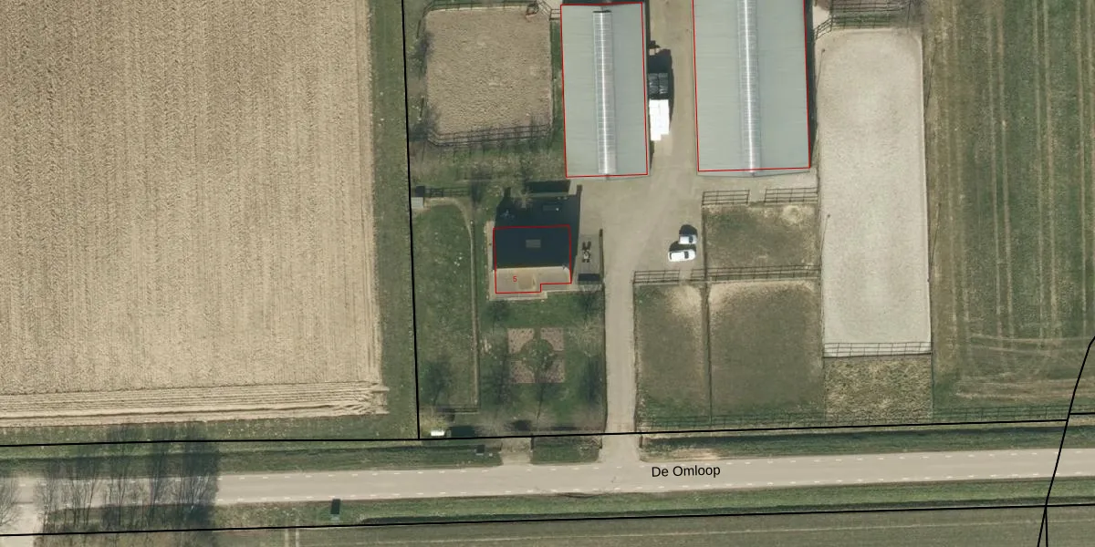 Het perceel waarop De Omloop 5 staat heeft een oppervlakte van 3,8 ha. Dit is een zeer groot perceel. De perceeloppervlakte wordt geregistreerd door het Kadaster. Gedetailleerde informatie over de maten van dit perceel kunt u vinden in het rapport Kadastrale kaart met maatvoering van De Omloop 5.