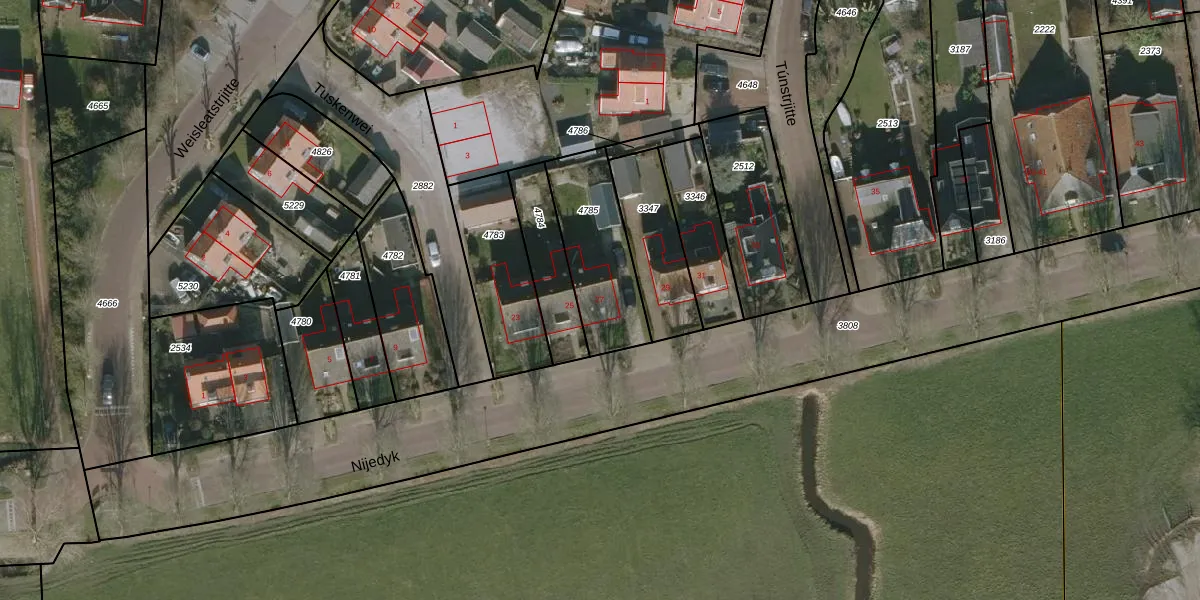 Het perceel waarop Nijedyk 27 staat heeft een oppervlakte van 355 m². Dit is een groot perceel. De perceeloppervlakte wordt geregistreerd door het Kadaster. Gedetailleerde informatie over de maten van dit perceel kunt u vinden in het rapport Kadastrale kaart met maatvoering van Nijedyk 27.