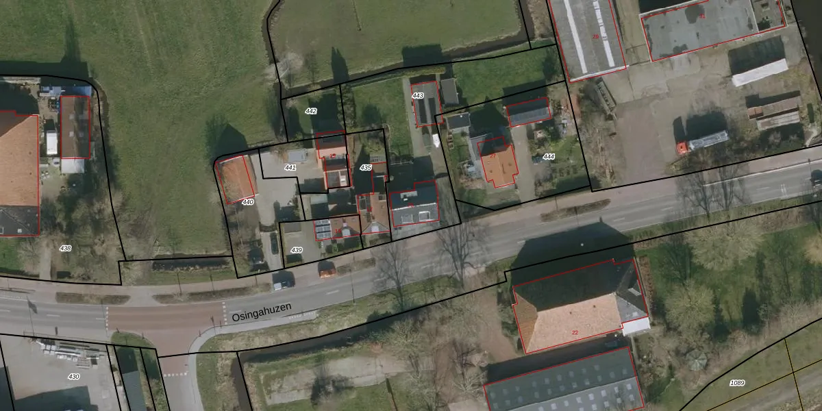 Het perceel waarop Osingahuzen 25 staat heeft een oppervlakte van 1035 m². Dit is een zeer groot perceel. De perceeloppervlakte wordt geregistreerd door het Kadaster. Gedetailleerde informatie over de maten van dit perceel kunt u vinden in het rapport Kadastrale kaart met maatvoering van Osingahuzen 25.