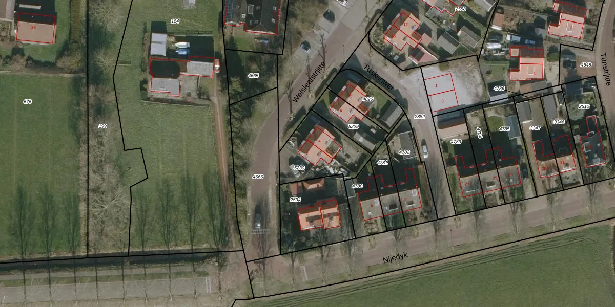 Het perceel waarop Weisleatstrjitte 2 staat heeft een oppervlakte van 447 m². Dit is een groot perceel. De perceeloppervlakte wordt geregistreerd door het Kadaster. Gedetailleerde informatie over de maten van dit perceel kunt u vinden in het rapport Kadastrale kaart met maatvoering van Weisleatstrjitte 2.