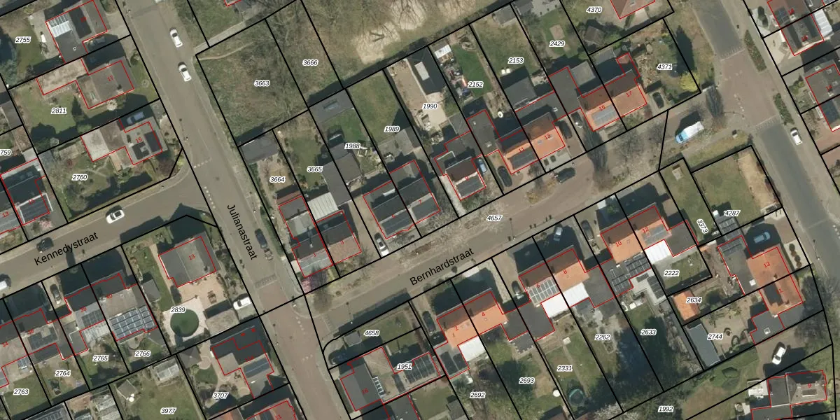 Het perceel waarop Bernhardstraat 7 staat heeft een oppervlakte van 400 m². Dit is een groot perceel. De perceeloppervlakte wordt geregistreerd door het Kadaster. Gedetailleerde informatie over de maten van dit perceel kunt u vinden in het rapport Kadastrale kaart met maatvoering van Bernhardstraat 7.