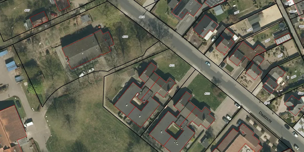 Het perceel waarop Daalzicht 1-e staat heeft een oppervlakte van 1955 m². Dit is een zeer groot perceel. De perceeloppervlakte wordt geregistreerd door het Kadaster. Gedetailleerde informatie over de maten van dit perceel kunt u vinden in het rapport Kadastrale kaart met maatvoering van Daalzicht 1-e.