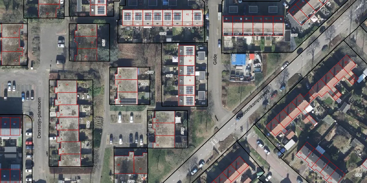 Het perceel waarop Gilde 4 staat heeft een oppervlakte van 872 m². Dit is een groot perceel. De perceeloppervlakte wordt geregistreerd door het Kadaster. Gedetailleerde informatie over de maten van dit perceel kunt u vinden in het rapport Kadastrale kaart met maatvoering van Gilde 4.