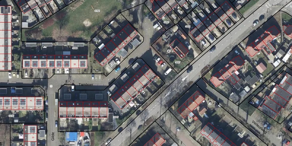 Het perceel waarop Tamboer 89 staat heeft een oppervlakte van 2037 m². Dit is een zeer groot perceel. De perceeloppervlakte wordt geregistreerd door het Kadaster. Gedetailleerde informatie over de maten van dit perceel kunt u vinden in het rapport Kadastrale kaart met maatvoering van Tamboer 89.