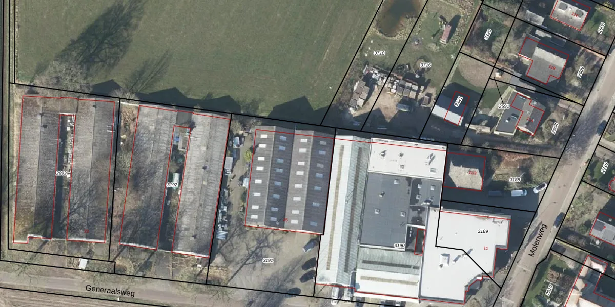 Het perceel waarop Generaalsweg 25 staat heeft een oppervlakte van 1850 m². Dit is een zeer groot perceel. De perceeloppervlakte wordt geregistreerd door het Kadaster. Gedetailleerde informatie over de maten van dit perceel kunt u vinden in het rapport Kadastrale kaart met maatvoering van Generaalsweg 25.