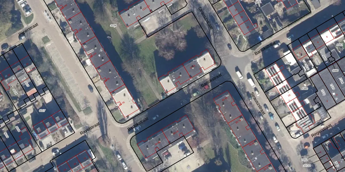Het perceel waarop Bartokstraat 9 staat heeft een oppervlakte van 6530 m². Dit is een zeer groot perceel. De perceeloppervlakte wordt geregistreerd door het Kadaster. Gedetailleerde informatie over de maten van dit perceel kunt u vinden in het rapport Kadastrale kaart met maatvoering van Bartokstraat 9.