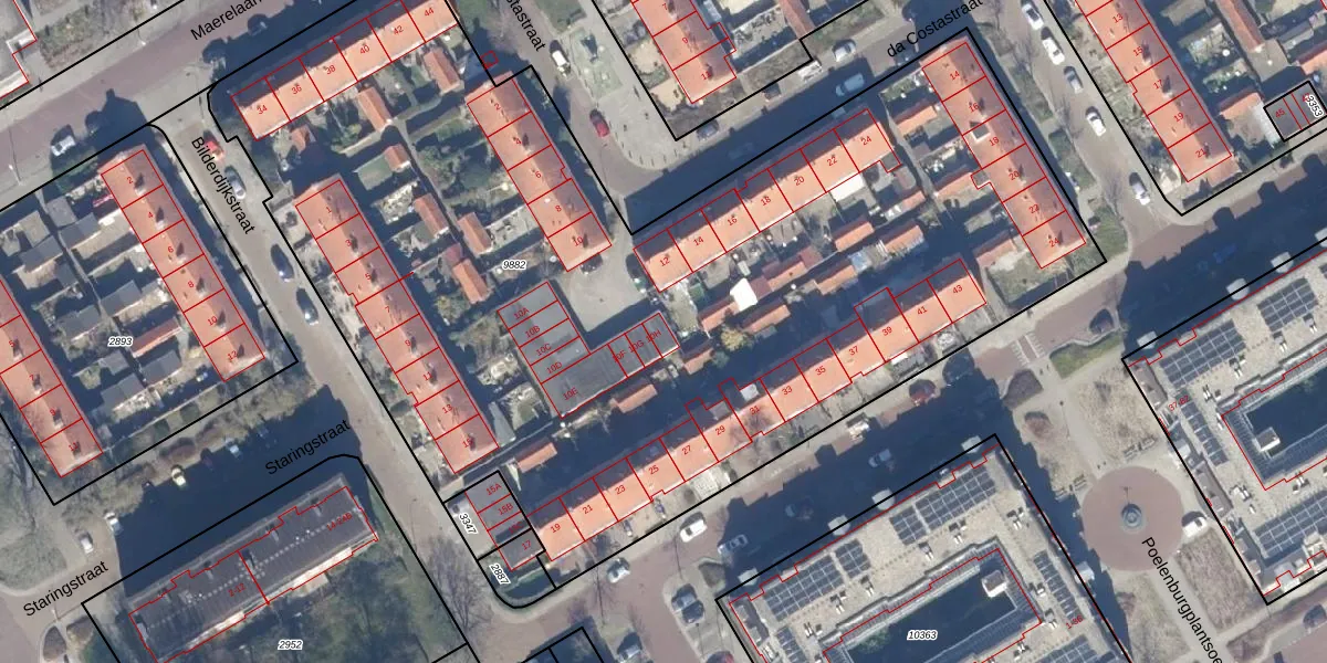 Het perceel waarop da Costastraat 10-H staat heeft een oppervlakte van 6240 m². Dit is een zeer groot perceel. De perceeloppervlakte wordt geregistreerd door het Kadaster. Gedetailleerde informatie over de maten van dit perceel kunt u vinden in het rapport Kadastrale kaart met maatvoering van da Costastraat 10-H.