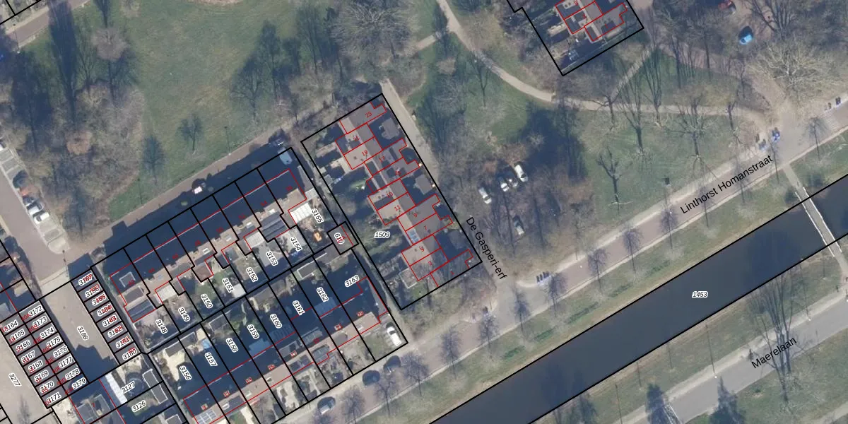 Het perceel waarop De Gasperi-erf 9 staat heeft een oppervlakte van 1016 m². Dit is een zeer groot perceel. De perceeloppervlakte wordt geregistreerd door het Kadaster. Gedetailleerde informatie over de maten van dit perceel kunt u vinden in het rapport Kadastrale kaart met maatvoering van De Gasperi-erf 9.