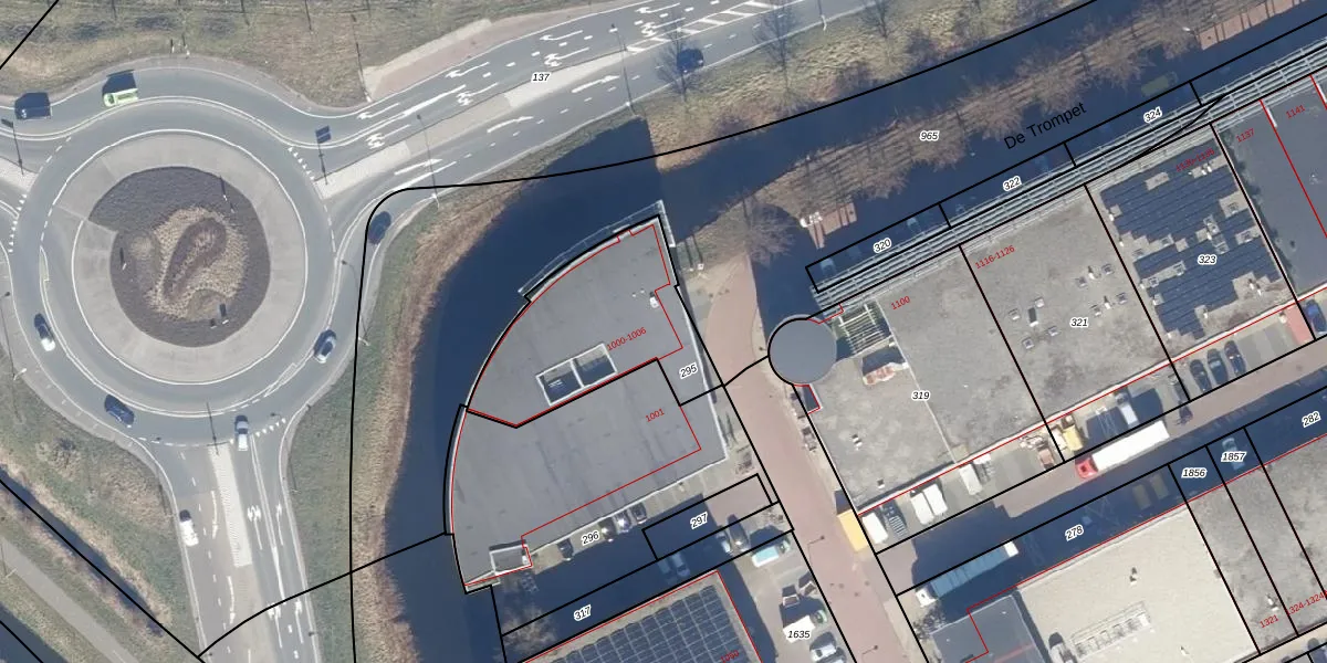 Het perceel waarop De Trompet 1000 staat heeft een oppervlakte van 635 m². Dit is een groot perceel. De perceeloppervlakte wordt geregistreerd door het Kadaster. Gedetailleerde informatie over de maten van dit perceel kunt u vinden in het rapport Kadastrale kaart met maatvoering van De Trompet 1000.