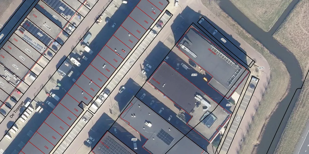Het perceel waarop De Trompet 2830 staat heeft een oppervlakte van 2670 m². Dit is een zeer groot perceel. De perceeloppervlakte wordt geregistreerd door het Kadaster. Gedetailleerde informatie over de maten van dit perceel kunt u vinden in het rapport Kadastrale kaart met maatvoering van De Trompet 2830.