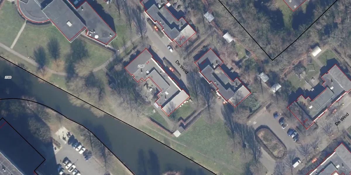 Het perceel waarop De Weid 4 staat heeft een oppervlakte van 5,3 ha. Dit is een zeer groot perceel. De perceeloppervlakte wordt geregistreerd door het Kadaster. Gedetailleerde informatie over de maten van dit perceel kunt u vinden in het rapport Kadastrale kaart met maatvoering van De Weid 4.