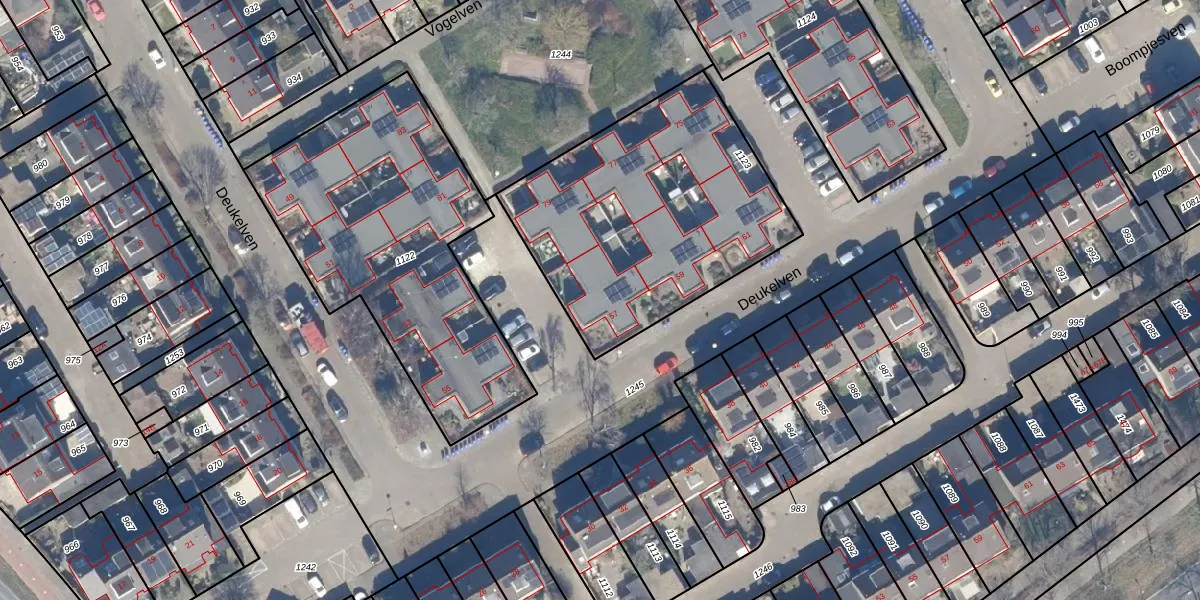 Het perceel waarop Deukelven 57 staat heeft een oppervlakte van 1294 m². Dit is een zeer groot perceel. De perceeloppervlakte wordt geregistreerd door het Kadaster. Gedetailleerde informatie over de maten van dit perceel kunt u vinden in het rapport Kadastrale kaart met maatvoering van Deukelven 57.