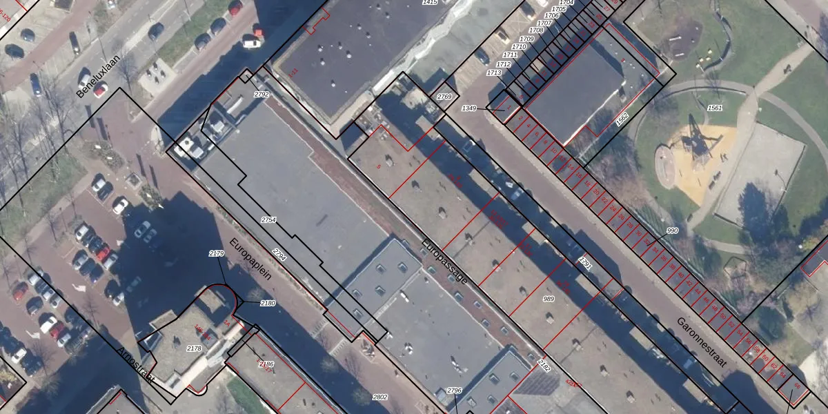Het perceel waarop Europassage 9 staat heeft een oppervlakte van 2581 m². Dit is een zeer groot perceel. De perceeloppervlakte wordt geregistreerd door het Kadaster. Gedetailleerde informatie over de maten van dit perceel kunt u vinden in het rapport Kadastrale kaart met maatvoering van Europassage 9.