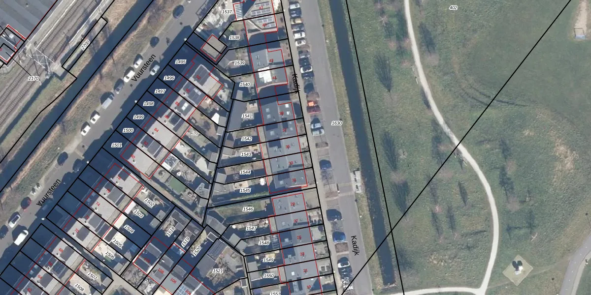 Het perceel waarop Kadijk 35 staat heeft een oppervlakte van 179 m². Dit is een middelgroot perceel. De perceeloppervlakte wordt geregistreerd door het Kadaster. Gedetailleerde informatie over de maten van dit perceel kunt u vinden in het rapport Kadastrale kaart met maatvoering van Kadijk 35.