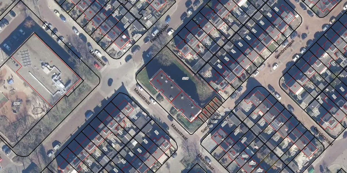 Het perceel waarop Maasstraat 106 staat heeft een oppervlakte van 1193 m². Dit is een zeer groot perceel. De perceeloppervlakte wordt geregistreerd door het Kadaster. Gedetailleerde informatie over de maten van dit perceel kunt u vinden in het rapport Kadastrale kaart met maatvoering van Maasstraat 106.