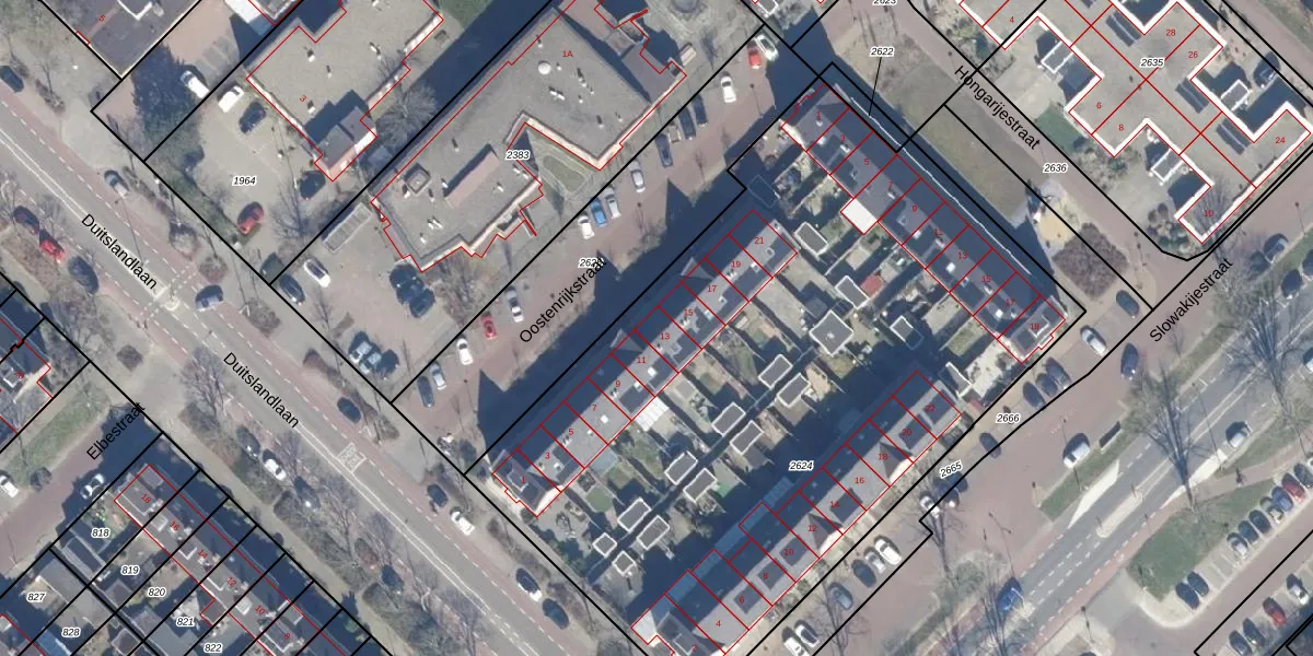 Het perceel waarop Oostenrijkstraat 13 staat heeft een oppervlakte van 4260 m². Dit is een zeer groot perceel. De perceeloppervlakte wordt geregistreerd door het Kadaster. Gedetailleerde informatie over de maten van dit perceel kunt u vinden in het rapport Kadastrale kaart met maatvoering van Oostenrijkstraat 13.