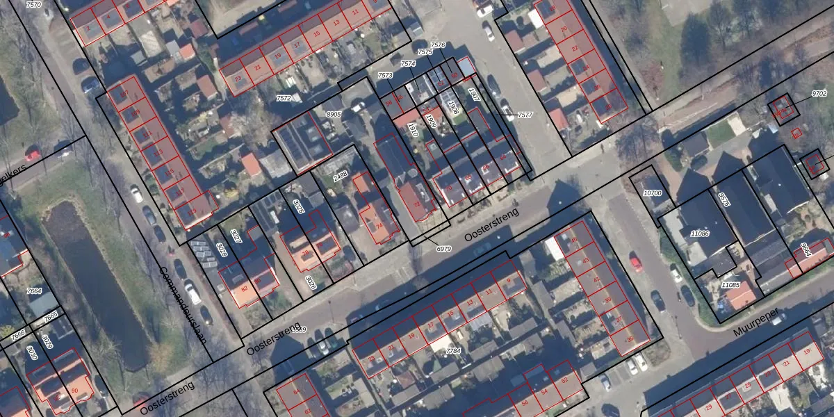 Het perceel waarop Oosterstreng 72 staat heeft een oppervlakte van 614 m². Dit is een groot perceel. De perceeloppervlakte wordt geregistreerd door het Kadaster. Gedetailleerde informatie over de maten van dit perceel kunt u vinden in het rapport Kadastrale kaart met maatvoering van Oosterstreng 72.