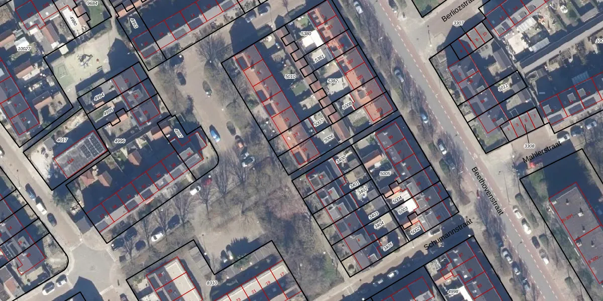 Het perceel waarop Schubertstraat 15 staat heeft een oppervlakte van 302 m². Dit is een groot perceel. De perceeloppervlakte wordt geregistreerd door het Kadaster. Gedetailleerde informatie over de maten van dit perceel kunt u vinden in het rapport Kadastrale kaart met maatvoering van Schubertstraat 15.