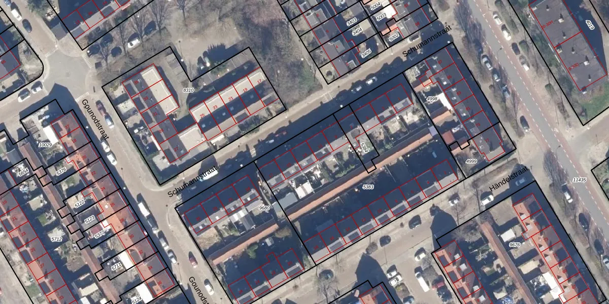 Het perceel waarop Schumannstraat 13 staat heeft een oppervlakte van 2174 m². Dit is een zeer groot perceel. De perceeloppervlakte wordt geregistreerd door het Kadaster. Gedetailleerde informatie over de maten van dit perceel kunt u vinden in het rapport Kadastrale kaart met maatvoering van Schumannstraat 13.