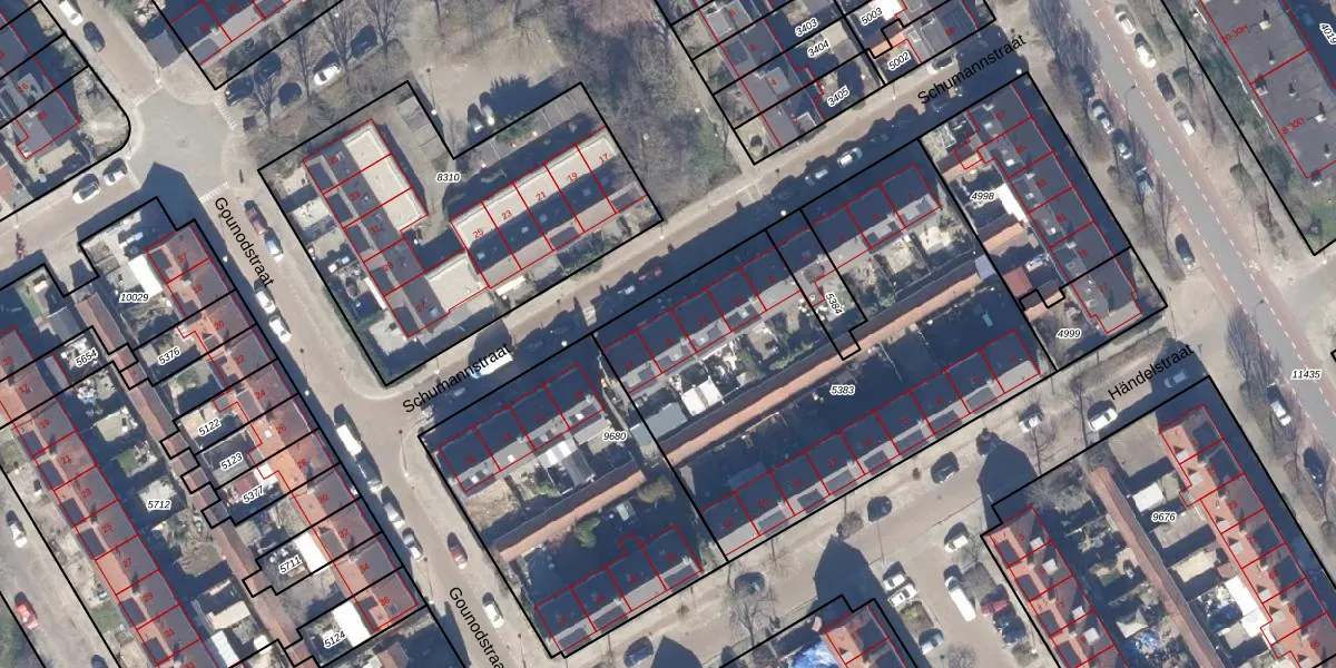 Het perceel waarop Schumannstraat 15 staat heeft een oppervlakte van 2174 m². Dit is een zeer groot perceel. De perceeloppervlakte wordt geregistreerd door het Kadaster. Gedetailleerde informatie over de maten van dit perceel kunt u vinden in het rapport Kadastrale kaart met maatvoering van Schumannstraat 15.