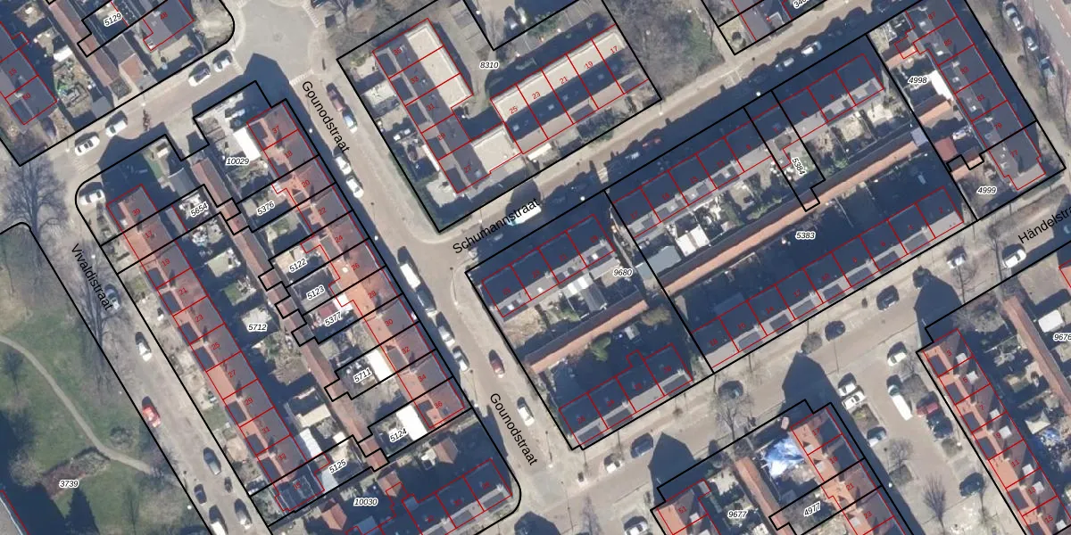 Het perceel waarop Schumannstraat 23 staat heeft een oppervlakte van 1195 m². Dit is een zeer groot perceel. De perceeloppervlakte wordt geregistreerd door het Kadaster. Gedetailleerde informatie over de maten van dit perceel kunt u vinden in het rapport Kadastrale kaart met maatvoering van Schumannstraat 23.