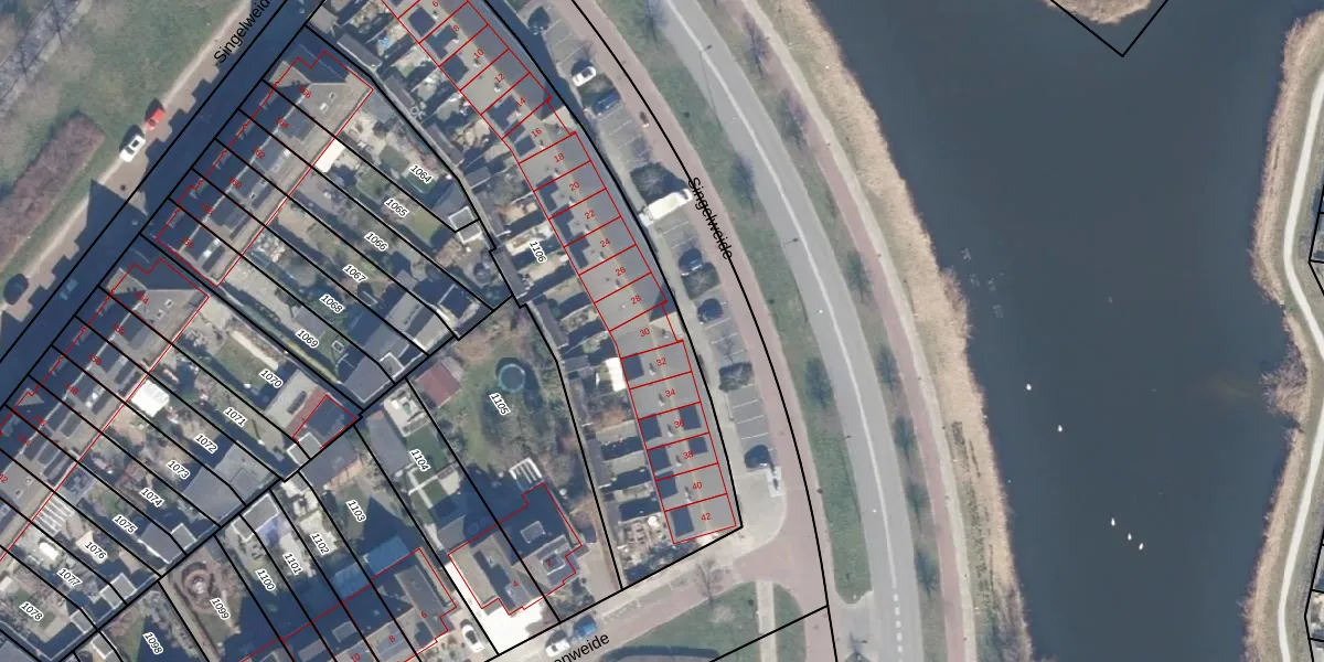 Het perceel waarop Singelweide 30 staat heeft een oppervlakte van 2165 m². Dit is een zeer groot perceel. De perceeloppervlakte wordt geregistreerd door het Kadaster. Gedetailleerde informatie over de maten van dit perceel kunt u vinden in het rapport Kadastrale kaart met maatvoering van Singelweide 30.