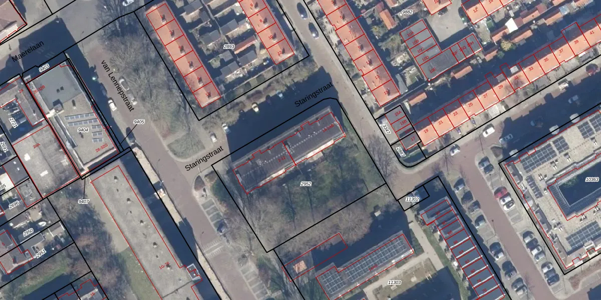 Het perceel waarop Staringstraat 16 staat heeft een oppervlakte van 1602 m². Dit is een zeer groot perceel. De perceeloppervlakte wordt geregistreerd door het Kadaster. Gedetailleerde informatie over de maten van dit perceel kunt u vinden in het rapport Kadastrale kaart met maatvoering van Staringstraat 16.