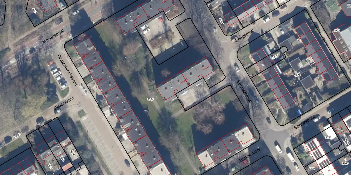 Het perceel waarop Strauszstraat 121 staat heeft een oppervlakte van 6530 m². Dit is een zeer groot perceel. De perceeloppervlakte wordt geregistreerd door het Kadaster. Gedetailleerde informatie over de maten van dit perceel kunt u vinden in het rapport Kadastrale kaart met maatvoering van Strauszstraat 121.