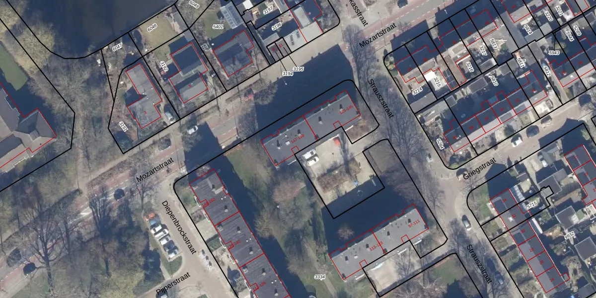 Het perceel waarop Strauszstraat 159 staat heeft een oppervlakte van 6530 m². Dit is een zeer groot perceel. De perceeloppervlakte wordt geregistreerd door het Kadaster. Gedetailleerde informatie over de maten van dit perceel kunt u vinden in het rapport Kadastrale kaart met maatvoering van Strauszstraat 159.