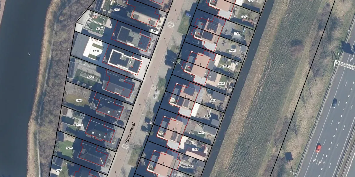 Het perceel waarop Stroomwal 16 staat heeft een oppervlakte van 353 m². Dit is een groot perceel. De perceeloppervlakte wordt geregistreerd door het Kadaster. Gedetailleerde informatie over de maten van dit perceel kunt u vinden in het rapport Kadastrale kaart met maatvoering van Stroomwal 16.
