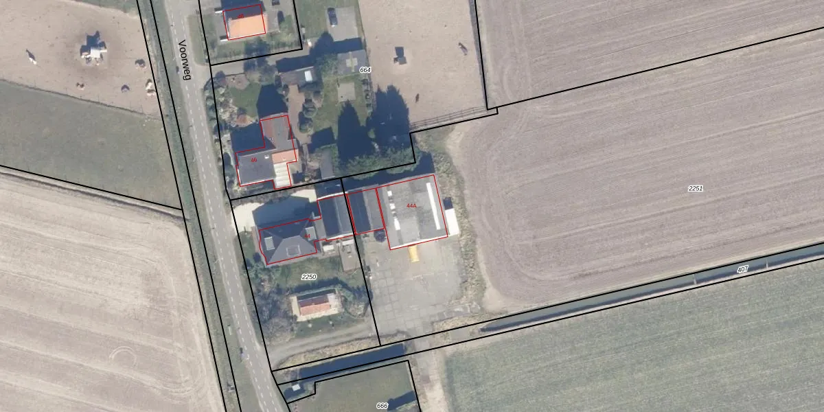 Het perceel waarop Voorweg 44-A staat heeft een oppervlakte van 8515 m². Dit is een zeer groot perceel. De perceeloppervlakte wordt geregistreerd door het Kadaster. Gedetailleerde informatie over de maten van dit perceel kunt u vinden in het rapport Kadastrale kaart met maatvoering van Voorweg 44-A.