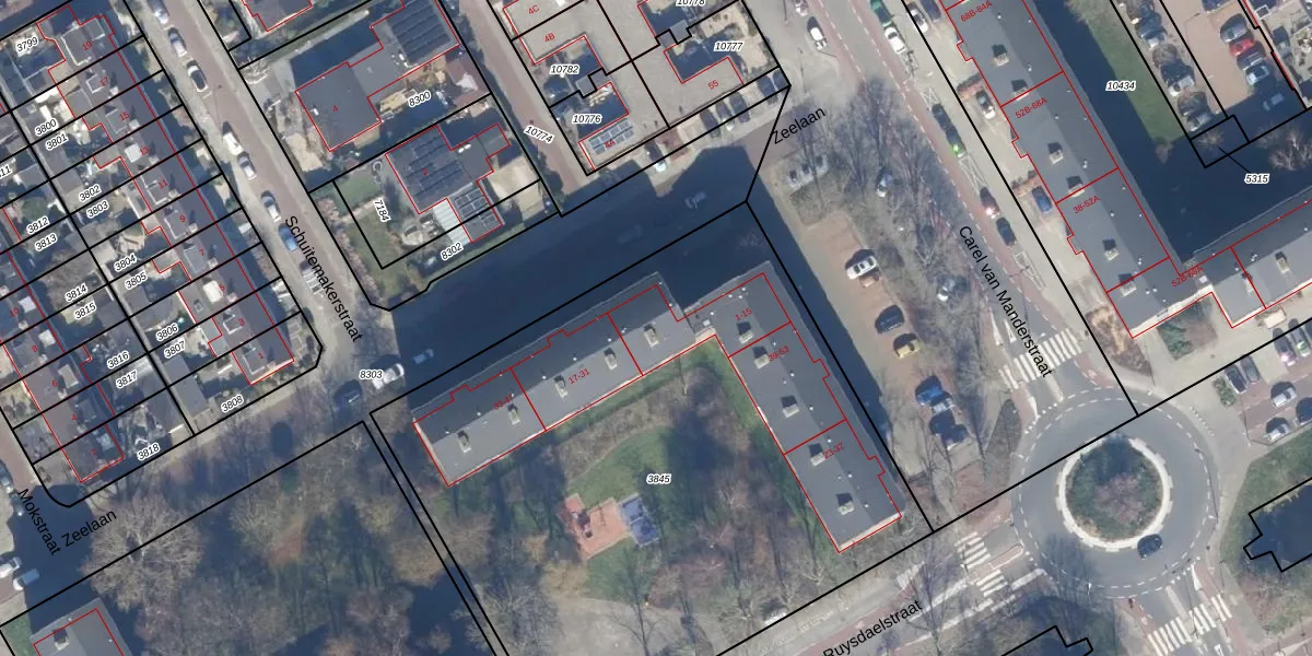 Het perceel waarop Zeelaan 13 staat heeft een oppervlakte van 3825 m². Dit is een zeer groot perceel. De perceeloppervlakte wordt geregistreerd door het Kadaster. Gedetailleerde informatie over de maten van dit perceel kunt u vinden in het rapport Kadastrale kaart met maatvoering van Zeelaan 13.