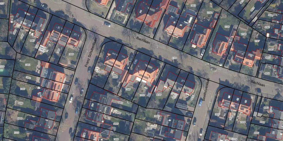 Het perceel waarop Bachlaan 18 staat heeft een oppervlakte van 384 m². Dit is een groot perceel. De perceeloppervlakte wordt geregistreerd door het Kadaster. Gedetailleerde informatie over de maten van dit perceel kunt u vinden in het rapport Kadastrale kaart met maatvoering van Bachlaan 18.