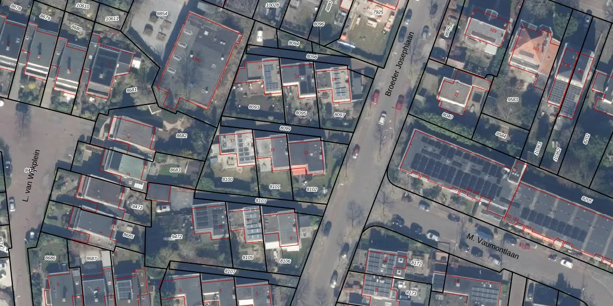 Broeder Josephlaan 13 is gelegen op kadastraal perceel HSD01B8102. Deze kadastrale aanduiding is uniek en wordt gebruikt door het Kadaster om eigendomsrechten en andere zakelijke rechten vast te leggen. Het perceel maakt onderdeel uit van de kadastrale gemeente Heemstede.