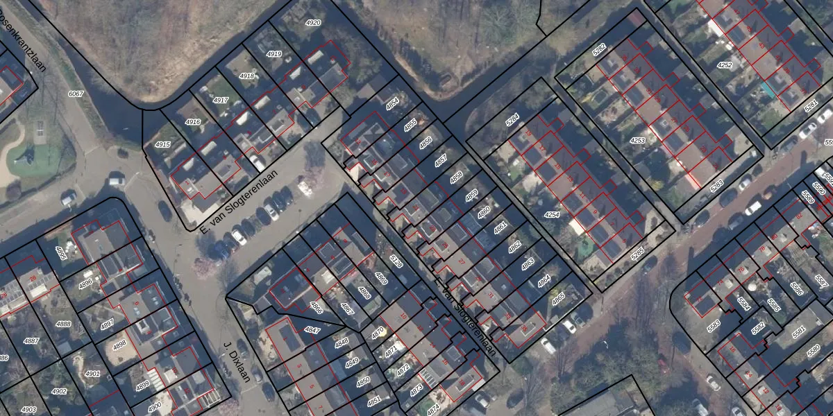 E. van Slogterenlaan 21 is gelegen op kadastraal perceel HSD01C4858. Deze kadastrale aanduiding is uniek en wordt gebruikt door het Kadaster om eigendomsrechten en andere zakelijke rechten vast te leggen. Het perceel maakt onderdeel uit van de kadastrale gemeente Heemstede.
