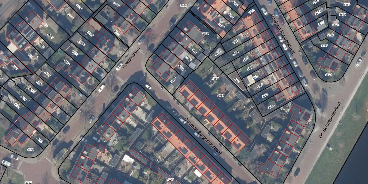 Het perceel waarop Goeman Borgesiusstraat 1 staat heeft een oppervlakte van 2561 m². Dit is een zeer groot perceel. De perceeloppervlakte wordt geregistreerd door het Kadaster. Gedetailleerde informatie over de maten van dit perceel kunt u vinden in het rapport Kadastrale kaart met maatvoering van Goeman Borgesiusstraat 1.
