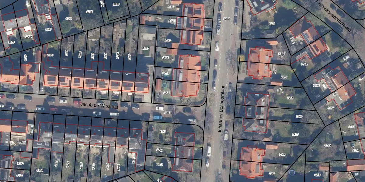 Jacob de Witstraat 21 is gelegen op kadastraal perceel HSD01A9206. Deze kadastrale aanduiding is uniek en wordt gebruikt door het Kadaster om eigendomsrechten en andere zakelijke rechten vast te leggen. Het perceel maakt onderdeel uit van de kadastrale gemeente Heemstede.