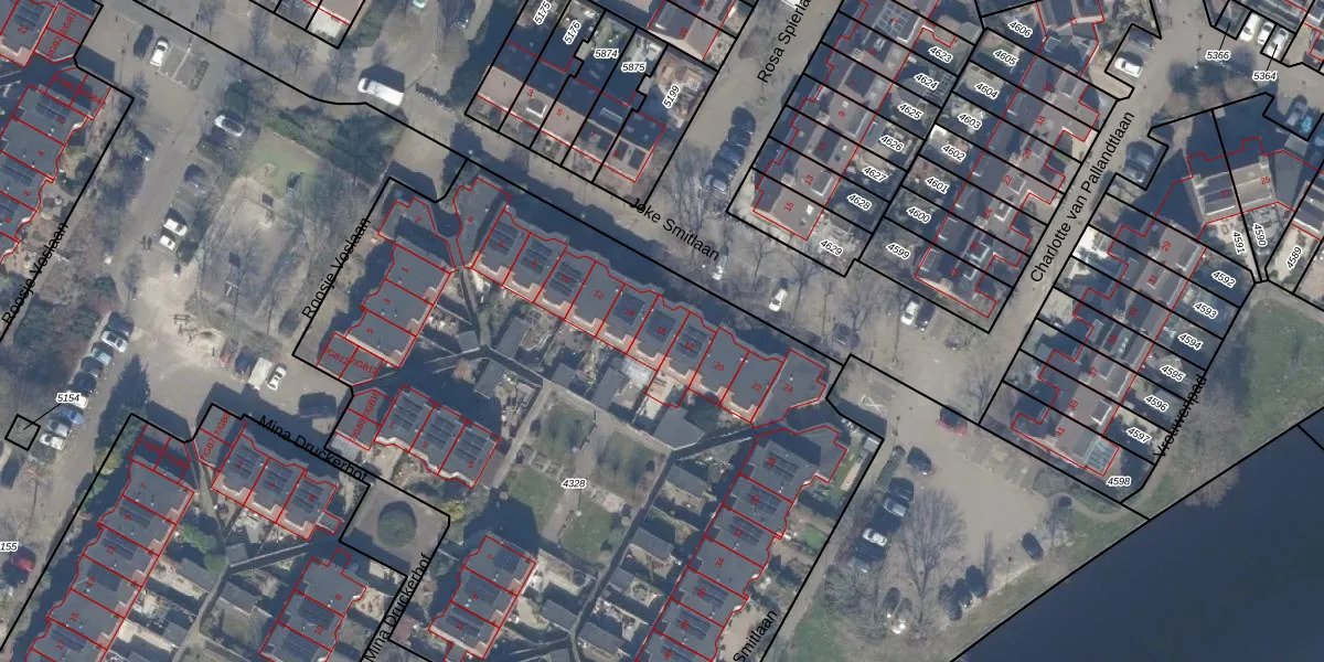 Het perceel waarop Joke Smitlaan 16 staat heeft een oppervlakte van 5285 m². Dit is een zeer groot perceel. De perceeloppervlakte wordt geregistreerd door het Kadaster. Gedetailleerde informatie over de maten van dit perceel kunt u vinden in het rapport Kadastrale kaart met maatvoering van Joke Smitlaan 16.