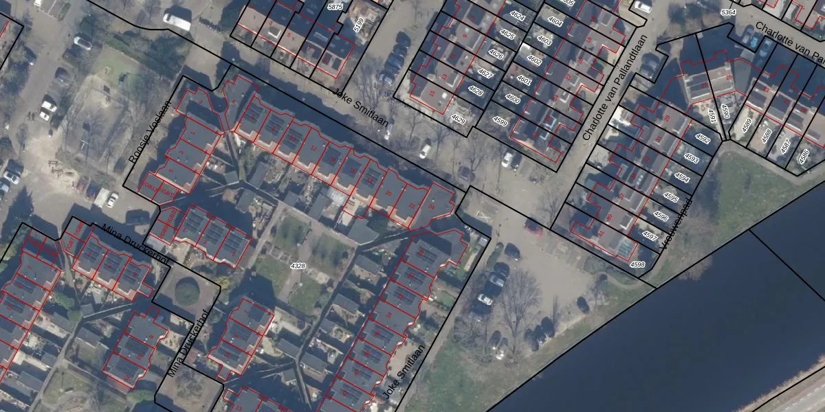 Het perceel waarop Joke Smitlaan 22 staat heeft een oppervlakte van 5285 m². Dit is een zeer groot perceel. De perceeloppervlakte wordt geregistreerd door het Kadaster. Gedetailleerde informatie over de maten van dit perceel kunt u vinden in het rapport Kadastrale kaart met maatvoering van Joke Smitlaan 22.