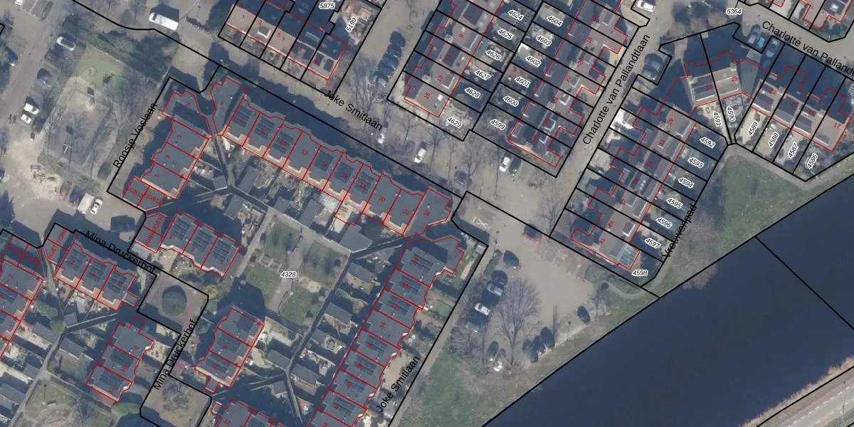 Het perceel waarop Joke Smitlaan 24 staat heeft een oppervlakte van 5285 m². Dit is een zeer groot perceel. De perceeloppervlakte wordt geregistreerd door het Kadaster. Gedetailleerde informatie over de maten van dit perceel kunt u vinden in het rapport Kadastrale kaart met maatvoering van Joke Smitlaan 24.