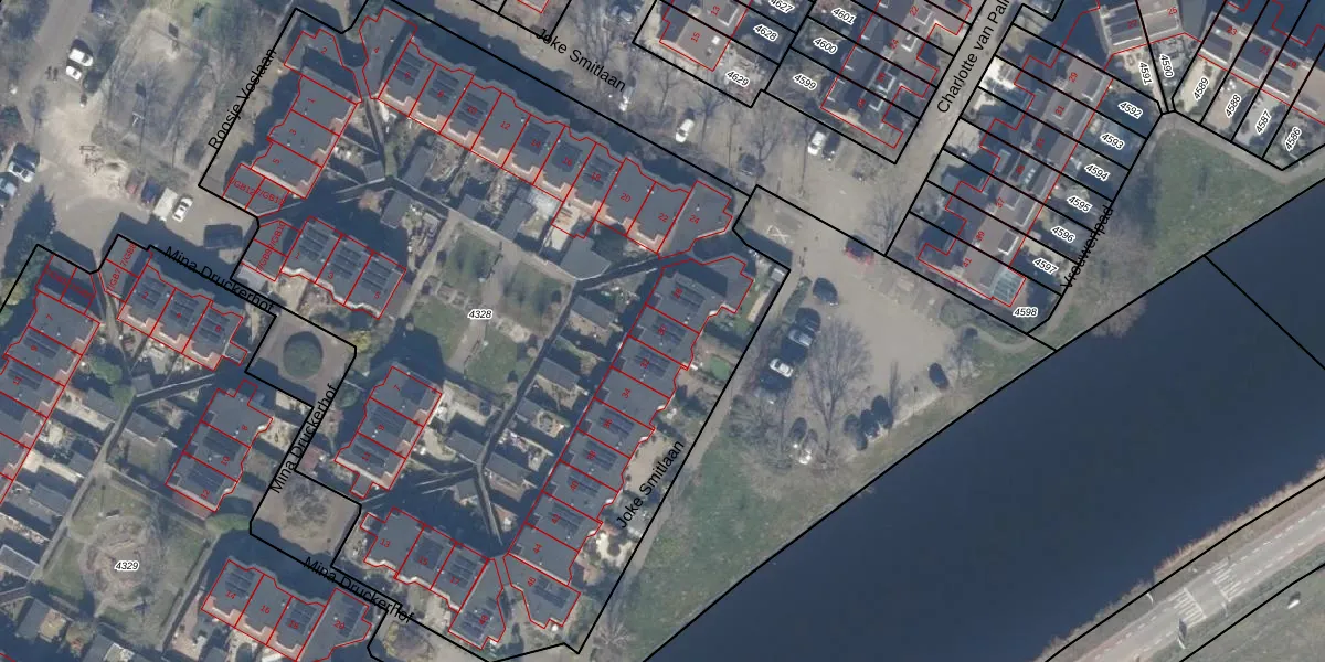 Het perceel waarop Joke Smitlaan 30 staat heeft een oppervlakte van 5285 m². Dit is een zeer groot perceel. De perceeloppervlakte wordt geregistreerd door het Kadaster. Gedetailleerde informatie over de maten van dit perceel kunt u vinden in het rapport Kadastrale kaart met maatvoering van Joke Smitlaan 30.