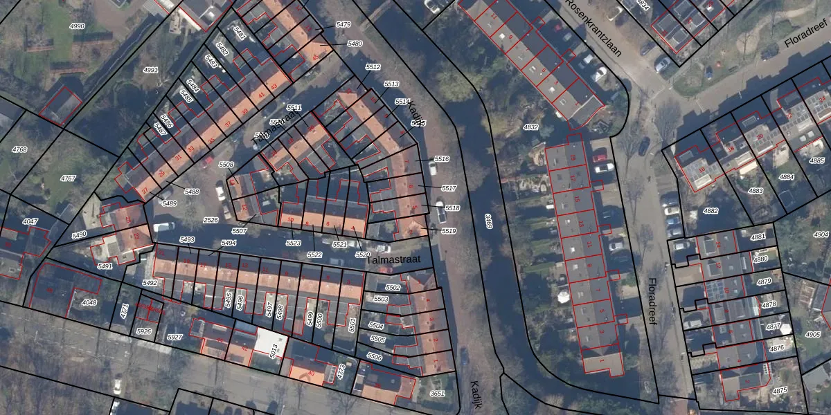 Het perceel waarop Kadijk 5 staat heeft een oppervlakte van 70 m². Dit is een klein perceel. De perceeloppervlakte wordt geregistreerd door het Kadaster. Gedetailleerde informatie over de maten van dit perceel kunt u vinden in het rapport Kadastrale kaart met maatvoering van Kadijk 5.