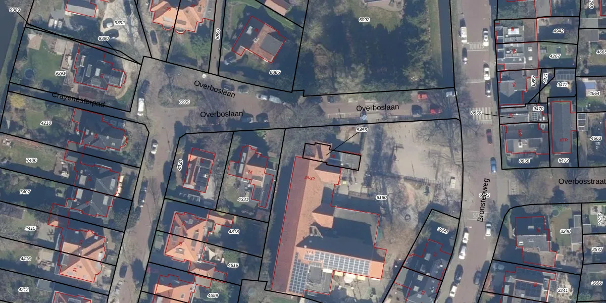 Het perceel waarop Overboslaan 26 staat heeft een oppervlakte van 3007 m². Dit is een zeer groot perceel. De perceeloppervlakte wordt geregistreerd door het Kadaster. Gedetailleerde informatie over de maten van dit perceel kunt u vinden in het rapport Kadastrale kaart met maatvoering van Overboslaan 26.