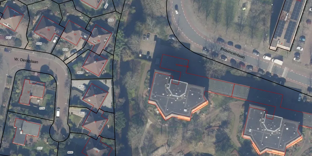 Het perceel waarop Provinciënlaan 7-D-2 staat heeft een oppervlakte van 2,1 ha. Dit is een zeer groot perceel. De perceeloppervlakte wordt geregistreerd door het Kadaster. Gedetailleerde informatie over de maten van dit perceel kunt u vinden in het rapport Kadastrale kaart met maatvoering van Provinciënlaan 7-D-2.